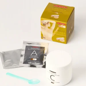 You mix the activator (A) and Tanaka powder (B) into the milky developer cream (C), stir into a smooth cream, apply to clean skin or body hair, leave it on for about 15–20 minutes, and then rinse thoroughly with water. Always follow the instructions on the packaging.
